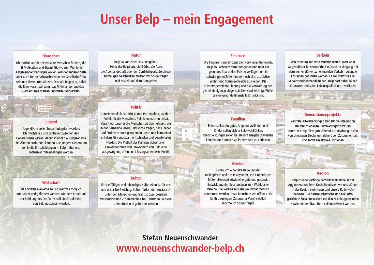 «Sachpolitik vor Parteipolitik. Bei Stefan steht unser Dorf mit seinen Einwohnern im Vordergrund und nicht eine Ideologie. Er hat ein offenes Ohr für alle. Genau einen solchen Vermittler braucht Belp im Gemeindepräsidium.»